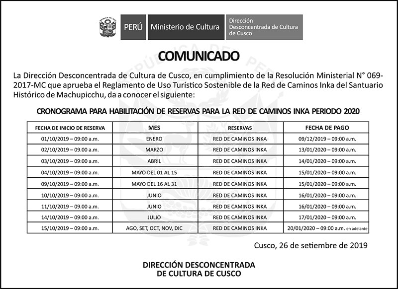Cronograma para habilitación de reservas para la red de camino inka periodo 2020