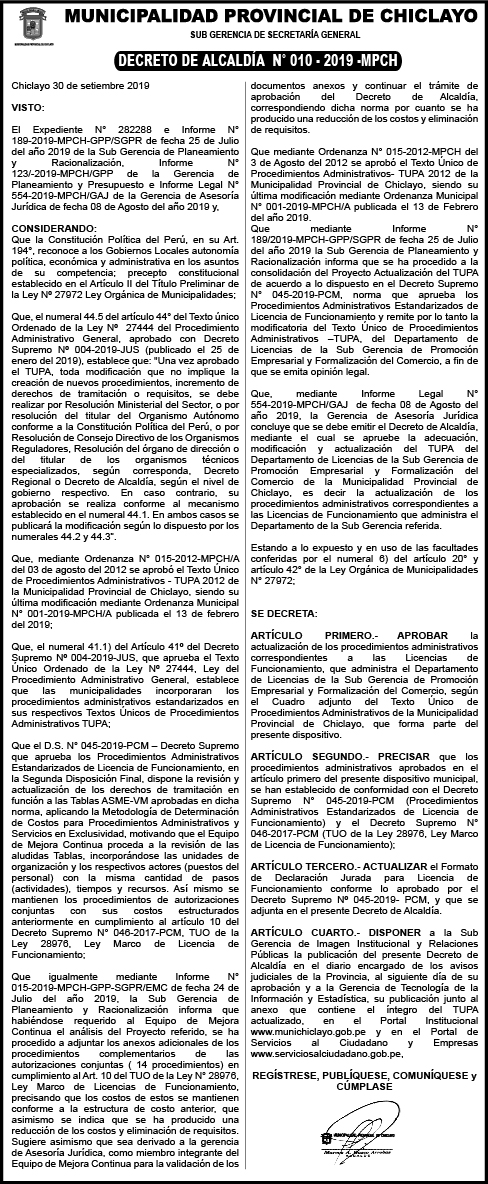 decreto de alcaldia n° 010-2019-MPCH