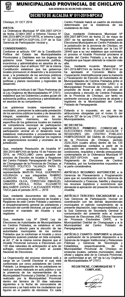 decreto de alcaldia n° 011-2019-MPCH