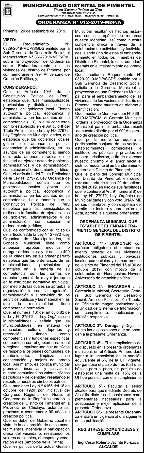 Ordenanza Municipal N° 012-2019-MDP