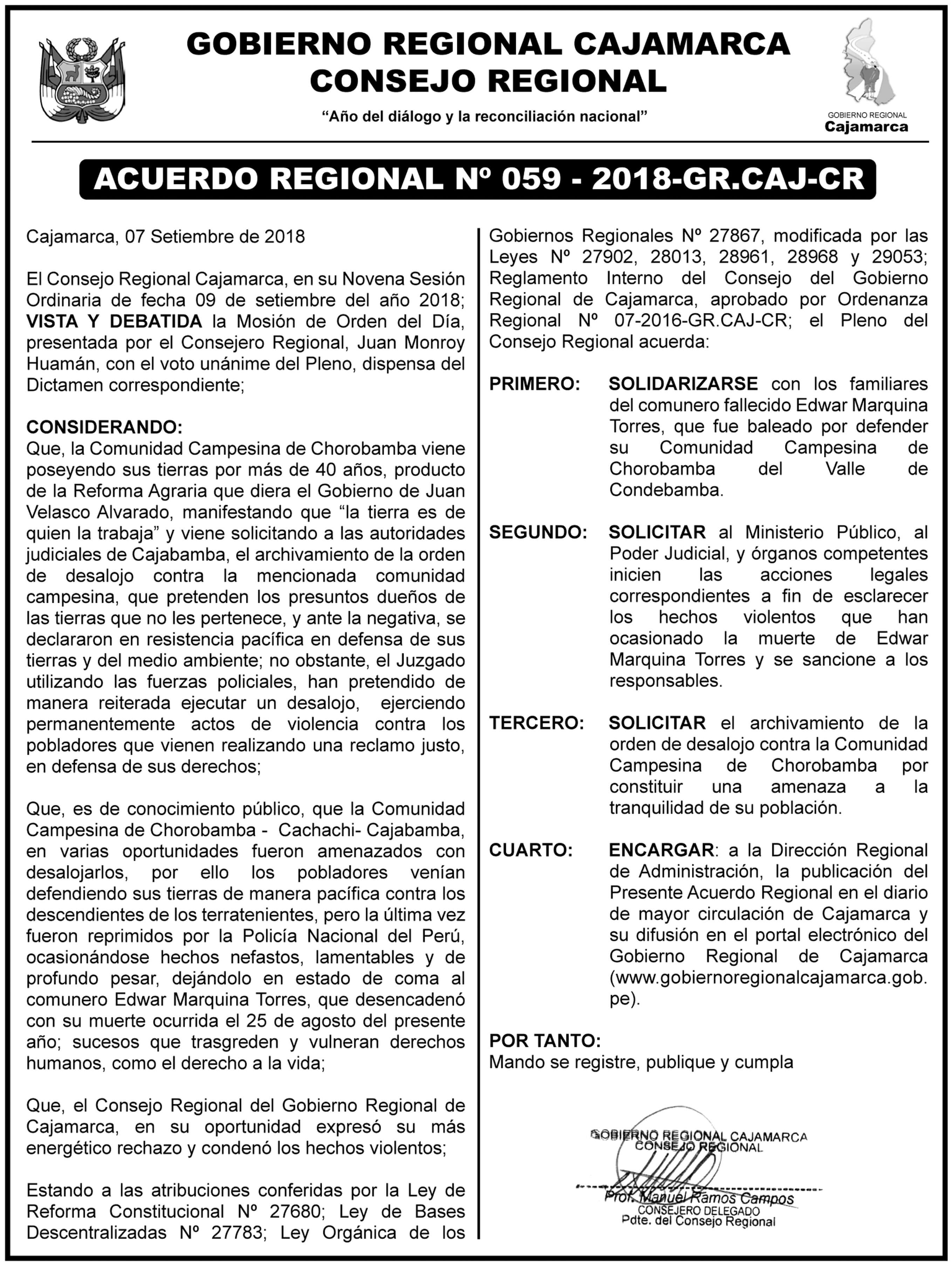 Acuerdo Regional N° 059-2018-GR.CAJ-CR